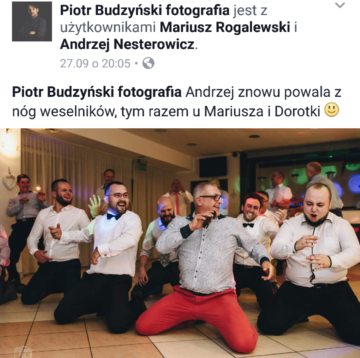 Jako pierwszy w Polsce pomysłodawca zmiany nudnych oklepanych zabaw na nowe integrujące WSZYSTKICH GOŚCI weselnych z kulturą(bez biegania czy picia alkoholu w ich trakcie), oraz producent zabaw dla DJ /wodzirejów/ zespołów muzycznych, wspólnie z żoną integrujemy Wszystkich gości, a nie zajmuję się kilkoma osobami tylko dlatego, by reszta nie czuła się pominięta lub zlekceważona.
